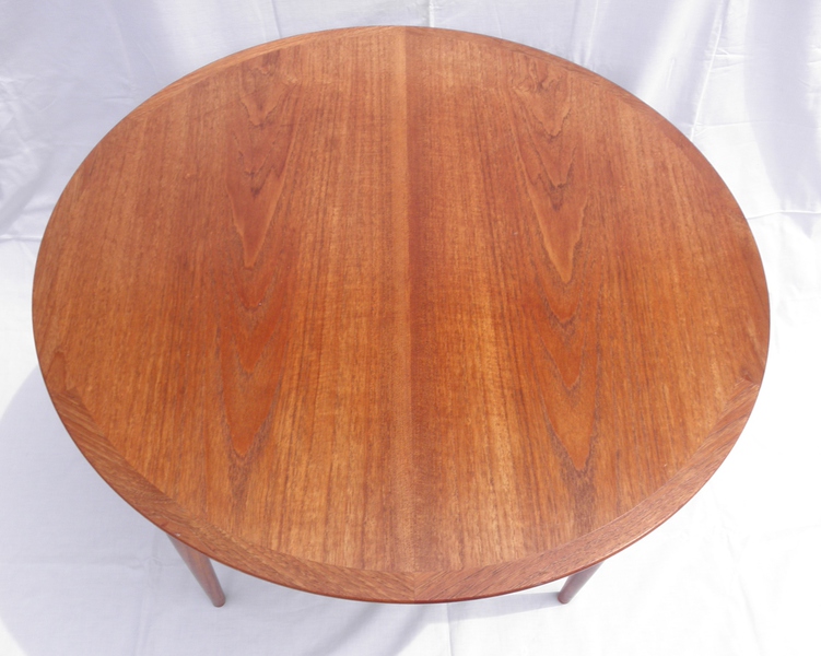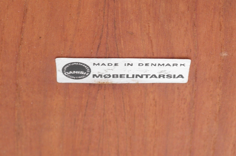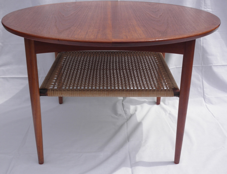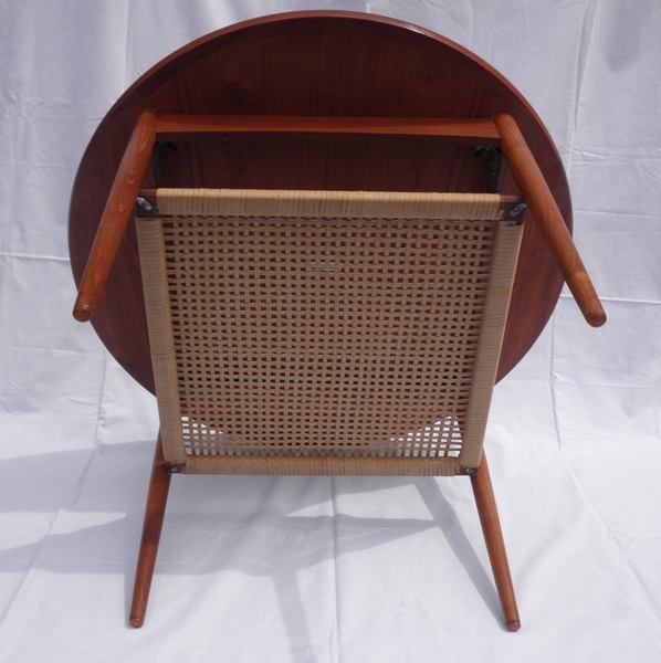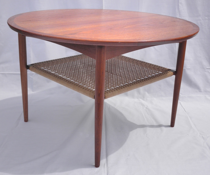 A 1960s Danish circular teak coffee table with square woven cord under-tier, raised on finely tapering legs with orange plastic foot buttons and labelled, MobelIntarsia, is in superb condition throughout.