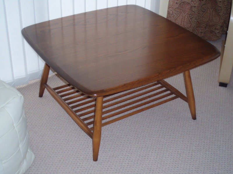 Another gem produced by Ercol, circa 1987, this truly pristine Model 767, square topped coffee or occasional table has obviously seen very little use, retaining the original finish, it is a rare find in such beautiful mint condition. The top is unmarked with a smooth ‘thumb’ edge and spindled magazine rack or undertier below standing on 4 turned, splayed legs. Inspired by Scandinavian design, this Ercol piece is a superb example of the good design, craftsmanship and use of quality materials that makes Ercol furniture as desirable today as when it was first made.
