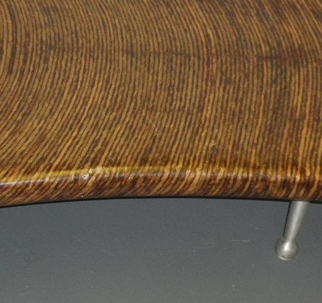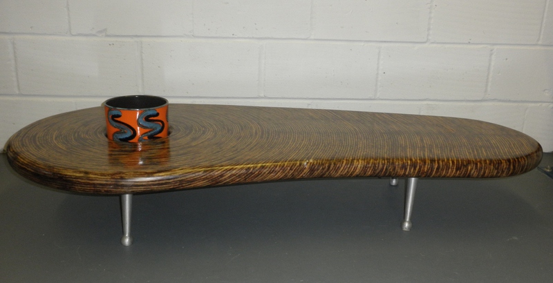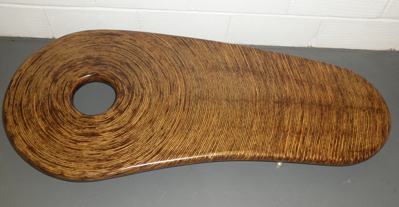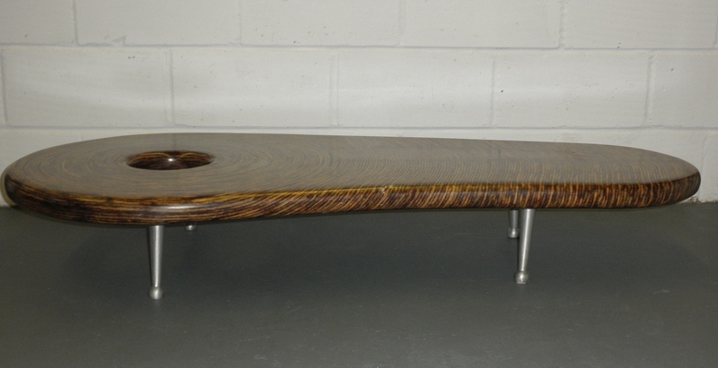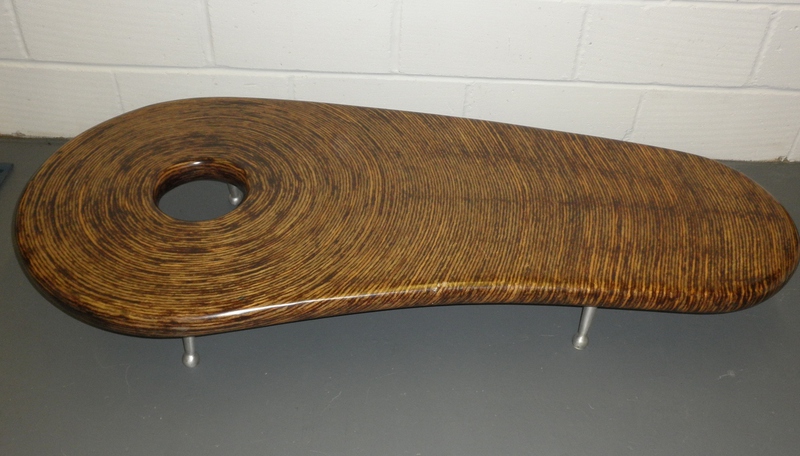 Made from a composite resin material and raised on aluminium legs, this extremely unusual coffee table designed by Clayton Tugonon (Filipino) in an elongated form terminating in a circle with a pierced centre and decorated in a swirling, striped ring pattern (like rings of a tree) in good condition with only a very small nick on one side of the table.