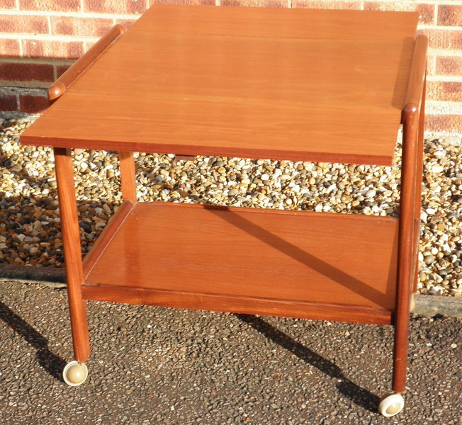 A versatile 1970s serving trolley in teak with a lipped undershelf and raised on sturdy, smooth running castors. Having nicely shaped upright supports, the trolley is sufficiently attractive to be used as a side table and the top having drop-leaf sides enabling quick conversion to a very useful supper table.