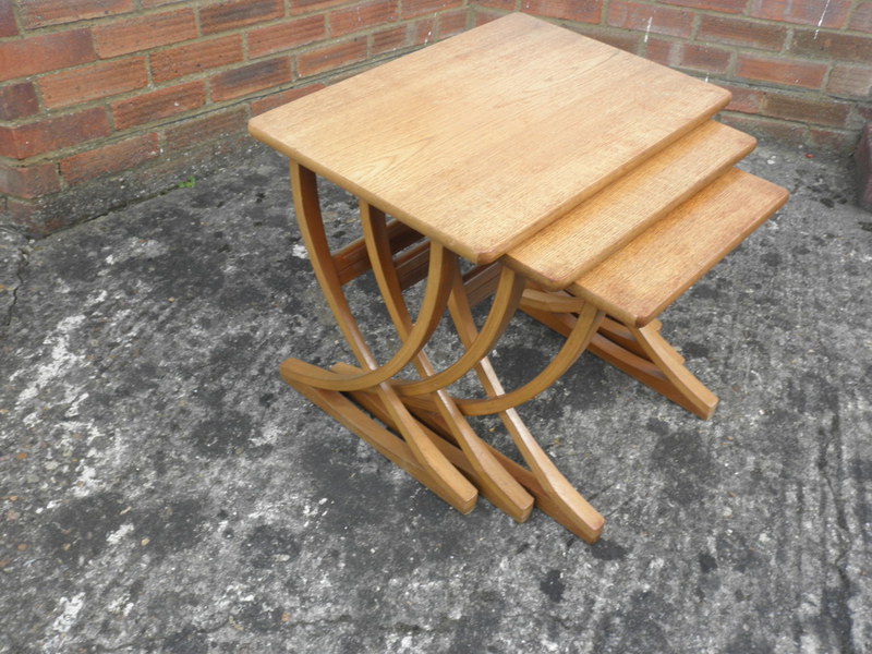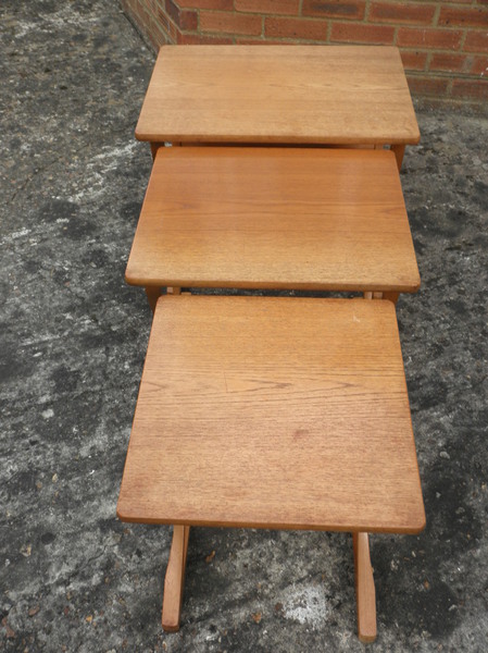 Mid-20th century, 1970s, Nest of coffee tables in light (or blonde) teak finish with unusual crossed leg design (reminiscent of vintage X-frame chairs). As with all Nathan furniture, the quality is very good and these tables remain sturdy with some minor fading to the edges commensurate with what can be expected with items of this age.