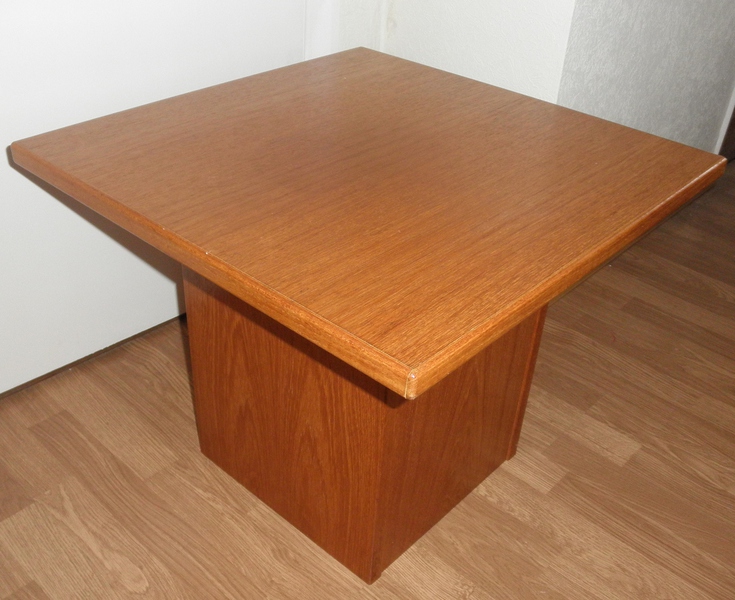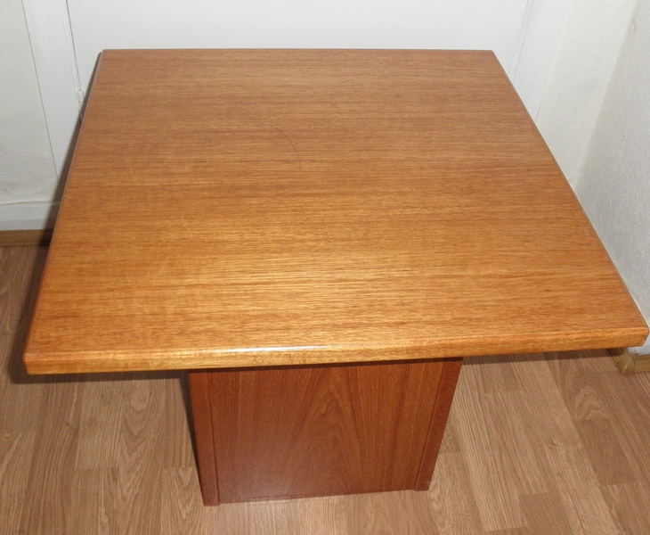 A slightly lower and smaller, light teak coffee table or side table by Gangso is also available, featuring a plain square top over a closed in square box-shaped base and the Gangso brand label. This table is in very good condition despite having some minor fading to the top surface which does not detract from the overall appearance.
