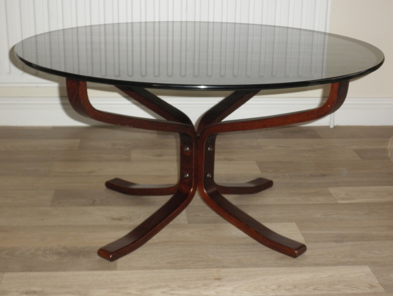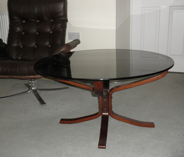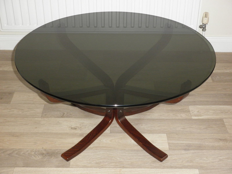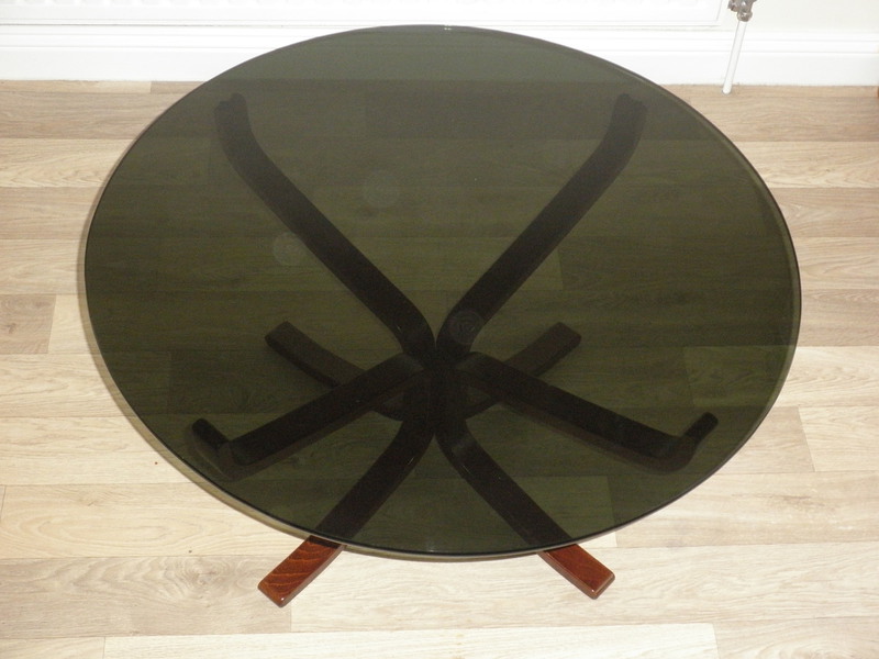 Dating from the early 1970s, this Falcon coffee table was designed by the famous Norwegian, Sigurd Resell (1920-2010) for Vatne Møbler. At 90cms in diameter, the generously sized circular top of smoked glass is raised on a four-branched bentwood stand bears the Vatne Mobler label.
