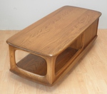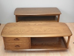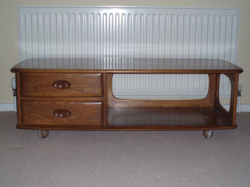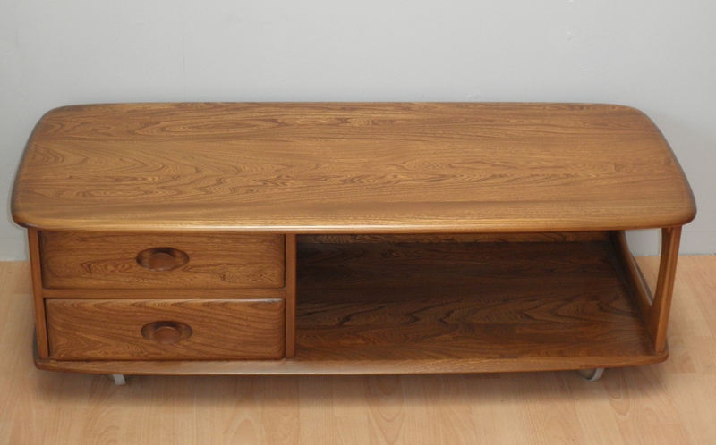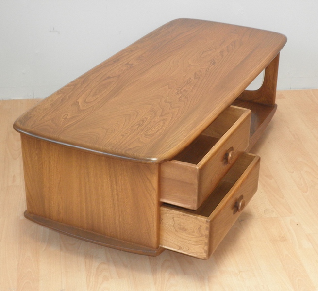 Totally original and rare to find in such superb condition this Ercol Minerva occasional table / coffee table or TV stand made from elm, was designed to be viewed from any angle with care having been taken to make all sides equally attractive. Standing on sturdy castors that move easily with two good sized drawers alongside a useful shelf, this piece of furniture is of exceptional quality and would complement any living-room setting.