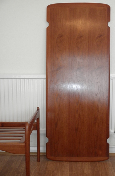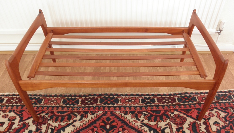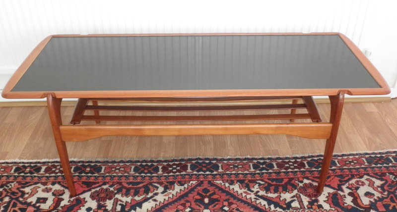 Dating from the 1960s, this rare and good-sized, rectangular Danish teak coffee table with a teak banded surround to the very practical reversible top in the manner of a Hans Wegner design combined with a stylish form reminiscent of a Kurt Ostervig design. One side is a beautifully patterned teak veneer and the reverse has a black formica inlay above a slatted under-tier / magazine rack. Raised on a distinctive and nicely shaped, sturdy frame, the table is in excellent condition throughout.