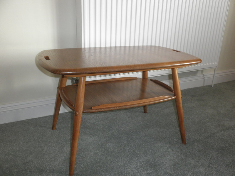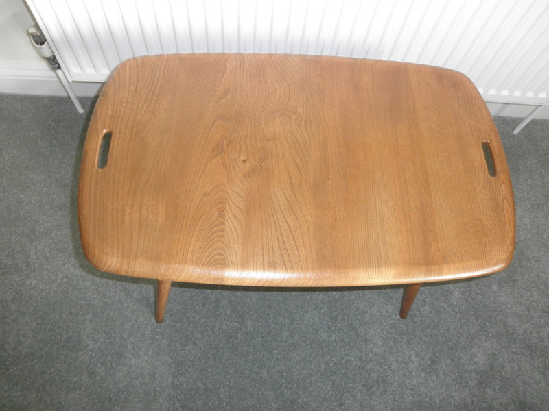 An Ercol tray table (sometimes referred to as a Butler’s Tray) with a beautiful and lipped under-shelf, finished in Ercol’s natural elm colour, bearing the mid-blue “Made in England” label, which Ercol used from 1957 to the mid-70s.