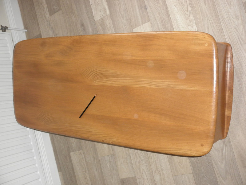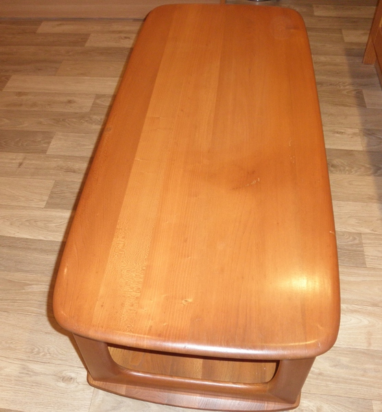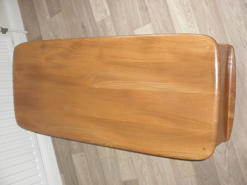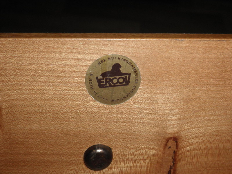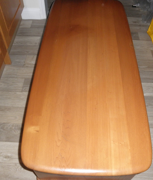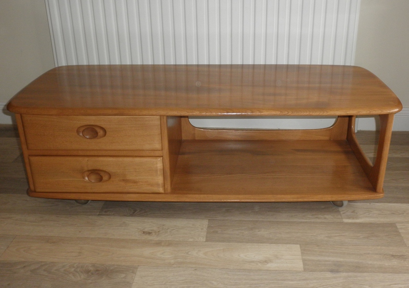 An Ercol ‘Minerva’ occasional table / coffee table or Media / TV stand, in the Golden Dawn finish, made from elm and designed so it can be viewed from any angle with care having been taken to make all sides equally attractive. Label states this unit was produced in 1983 and is raised on sturdy castors that move easily with two good sized drawers alongside a useful shelf. This piece of quality furniture is in good, original, unrestored condition showing minor scuff marks and an impression ding - to the top surface (see photos) which do not detract greatly from the overall appearance and is priced accordingly.