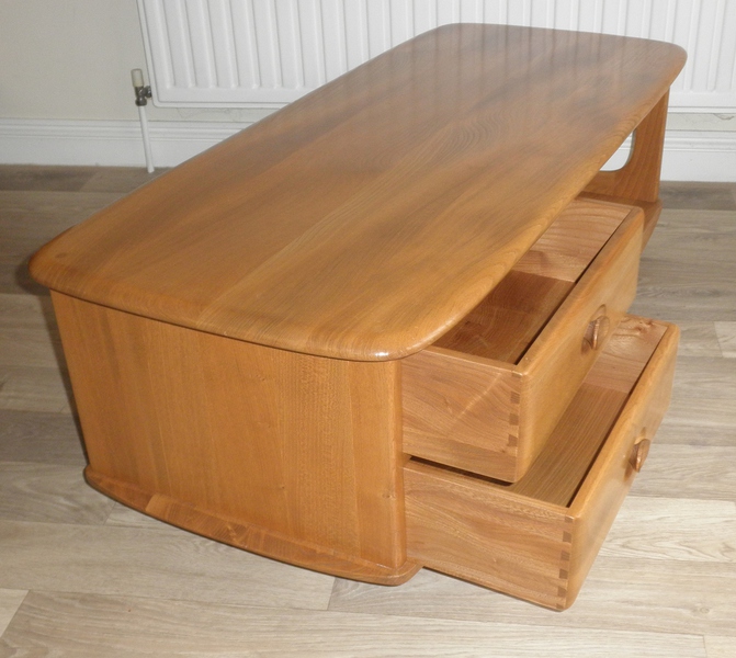 An Ercol ‘Minerva’ occasional table / coffee table or Media / TV stand, in Ercol's natural finish, made from elm and designed so it can be viewed from any angle with care having been taken to make all sides equally attractive. Label indicates this unit was produced between 1981-1995 and is raised on sturdy castors that move easily with two good sized drawers alongside a useful shelf, this piece of quality furniture is in good, original, unrestored condition showing minor marks to the top surface (see photo) which does not detract greatly from the overall appearance and is priced accordingly.