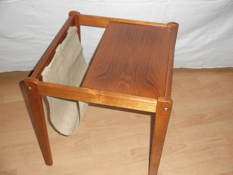 A Danish design labelled and produced by BRDR-Furbo Spottrup, Made in Denmark. This 1960s vintage teak side table has a canvas magazine sling suspended from dowels and is in good condition commensurate with age and use.