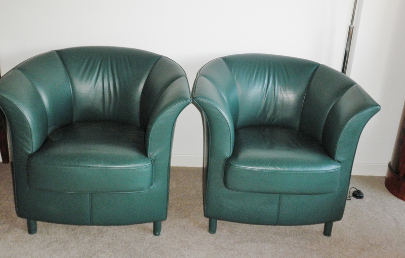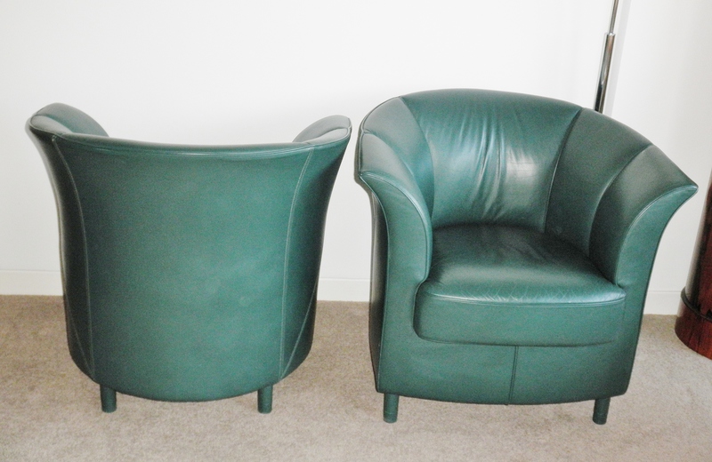 An extremely attractive and very comfortable pair of barrel or tub chairs covered (including the feet) in good quality, sea green leather, reminiscent of a Josef Hoffmann design during the transition between the Art Nouveau and Art Deco periods.