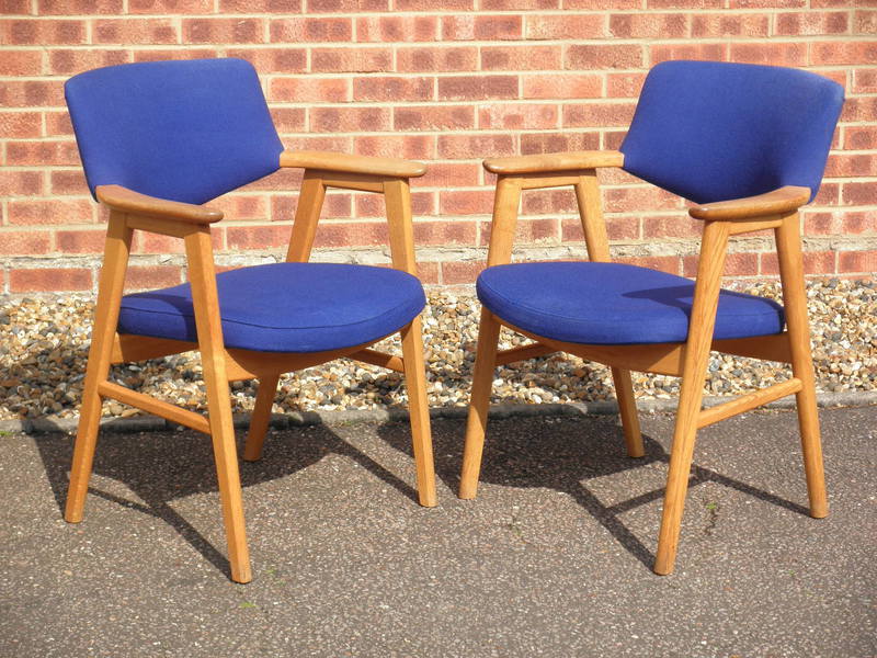 Pair of oak chairs with arm rests designed by Erik Kirkegaard and produced by the Danish manufacturer, Høng Stolefabrik, around 1958/1960. With a very comfortable seating position, good back support and arm rests, these chairs make an excellent dining, desk or classic mid 20th century armchair.