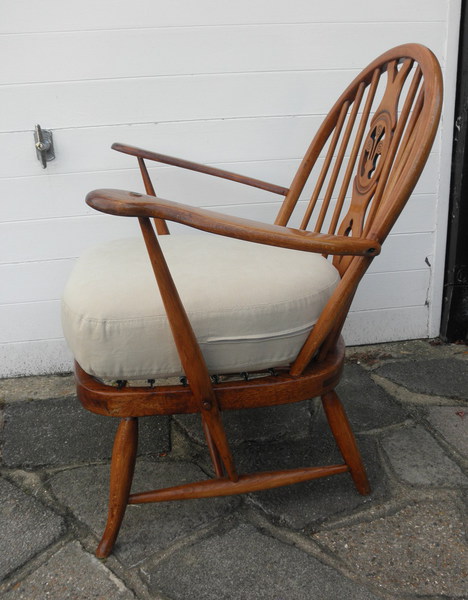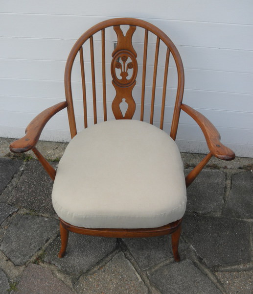 A very early (circa 1950) Ercol Windsor Fleur de Lis (Fleur de Lys) armchair in a mid to light finish. The chair is a very pretty chair in original, excellent vintage condition and comprises the early spring base, gently tapering legs and a new foam filled cushion (which elevates the sitting position) covered in a beige cotton fabric.