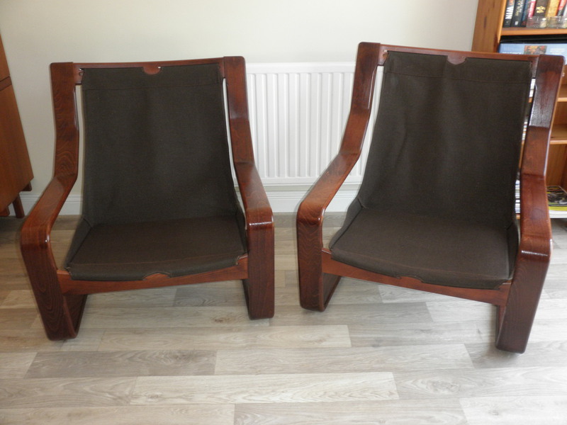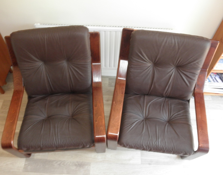 This comfortable pair of mid-20th century lounge chairs after a design by Ingmar Relling (1920-2002), with the distinctive Scandinavian style of a canvas sling support on the bentwood frames with well-padded, dark chocolate brown, buttoned leather cushions. The quality of these chairs is exceptional, and the overall condition, excellent - the leather is tear and relatively scuff free with all original buttons in place.