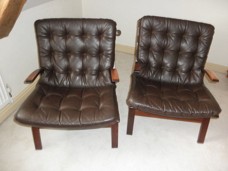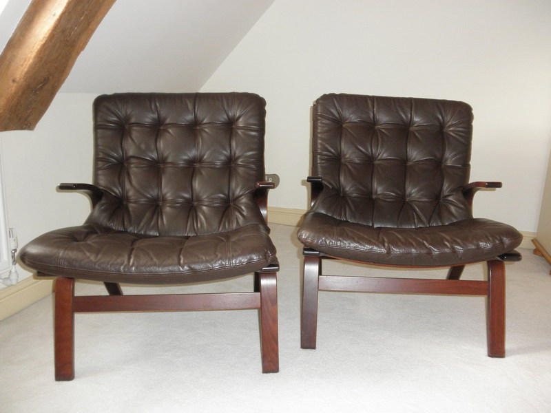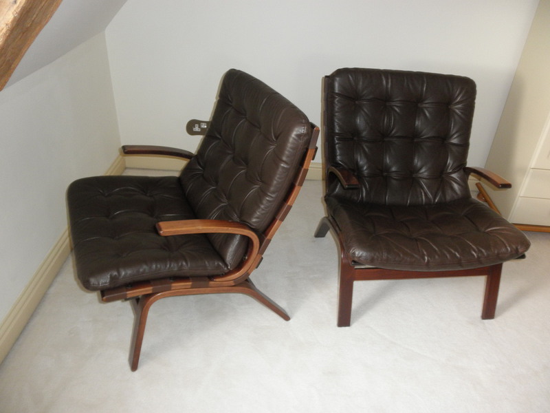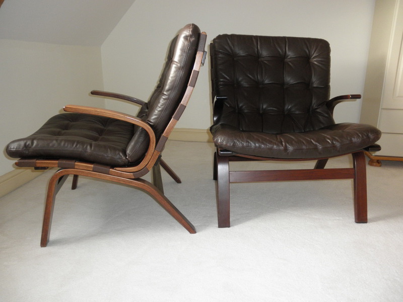 A comfortable pair of mid 20th century lounge chairs after a design by Ingmar Relling (1920-2002), with the distinctive Scandinavian style of canvas support on the bentwood frames with arms and well-padded, dark chocolate brown, buttoned leather cushions. Although unattributed, the exceptional quality of these chairs would indicate that they were produced by Farstrup. Overall the condition is excellent with only minor signs of age related wear and the leather continues to be tear and relatively scuff free with all original buttons in place.