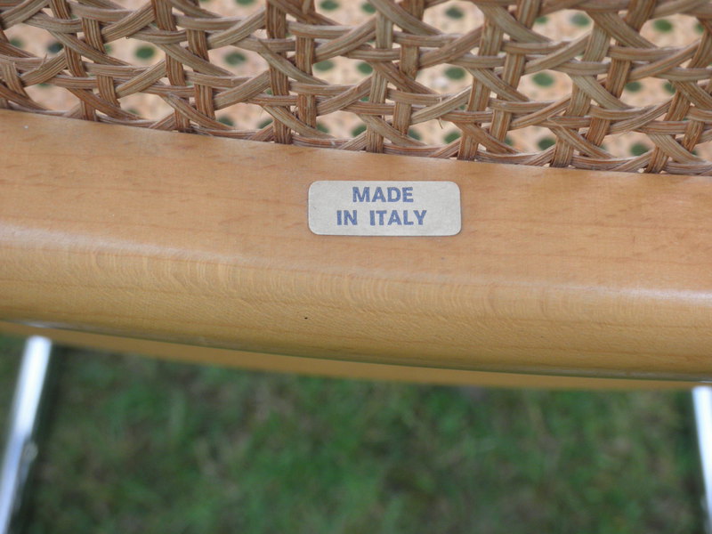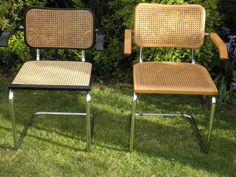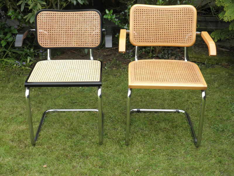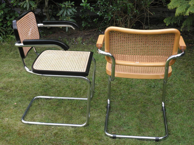 These tubular steel framed, cantilever chairs with hand-woven cane seats and back rests were designed by Marcel Breuer in 1928 while at the Bauhaus. The Cesca chair was named after his daughter, Francesca, and this design continues to be a timeless classic, known for flexibility and a comfortable seating position. The beech frame chair still has the Made in Italy label and is in excellent, used condition. The black lacquered chair does have a small split in the cane to the right of the back rest just above the arm and minor rust spots but is otherwise in very good, used condition.