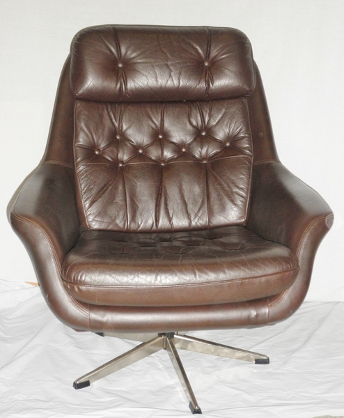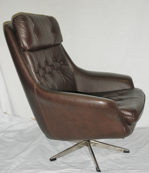 A Danish high back, lounge chair in the classic H W Klein design for Bramin, faced in dark chocolate brown leather. This very comfortable, swivelling armchair has nicely detailed buttoning to the cushions and a 5-branch chrome stand – all of which are in very good, unmarked, condition.