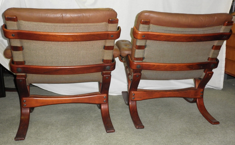 This mid-20th century Scandinavian pair of lounge chairs in coffee-coloured leather (most probably Norwegian) after a design by Ingmar Relling (1920-2002), with the distinctive Westnofa Mobelfabrikk style of canvas supports on sturdy bentwood frames and legs, with well-padded and buttoned leather seats, backs and arms. A very comfortable pair of armchairs.