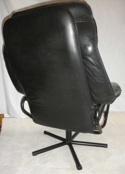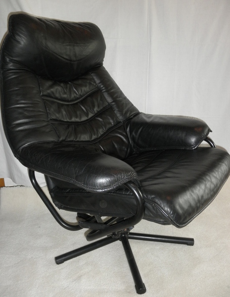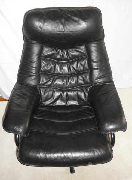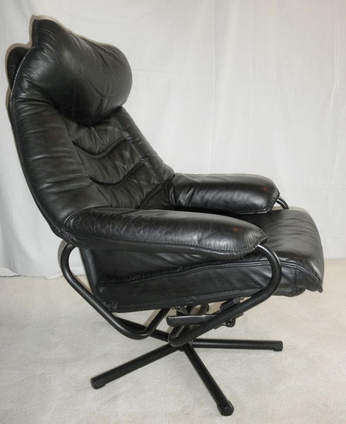 A Skoghaug Industries, Norway, labelled high back, swivel recliner standing on a 5-branched black coated steel base from the late 1960s/1970s has a smooth swivel and reclining mechanism which adjusts the seat through to an almost horizontal position. This Scandinavian armchair has soft black leather cushioning in extremely good, unmarked condition and makes this a very stable and comfortable lounger.