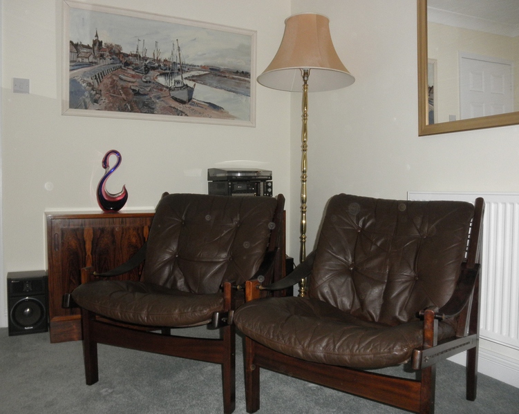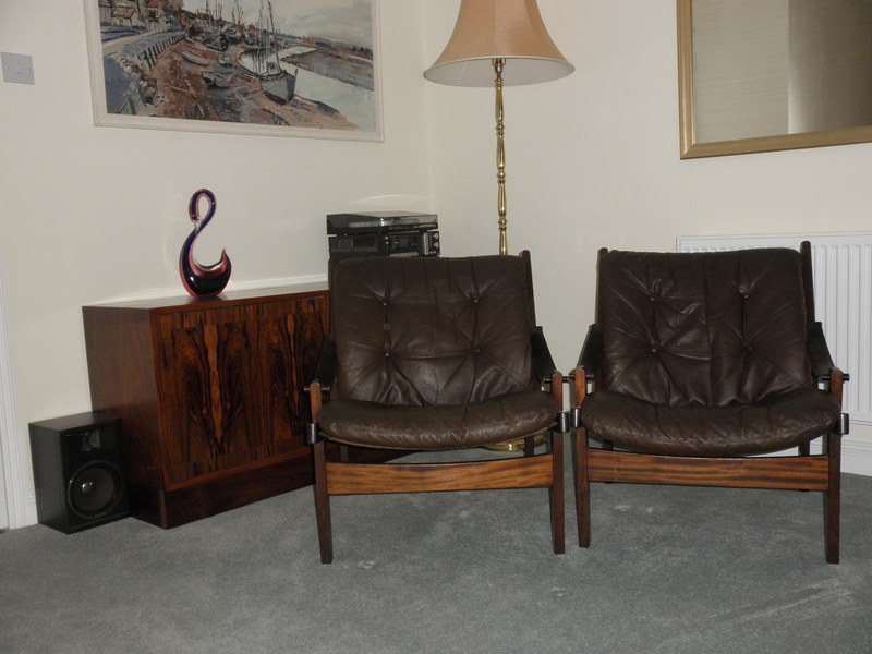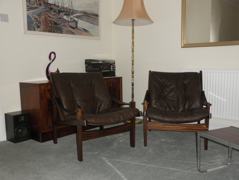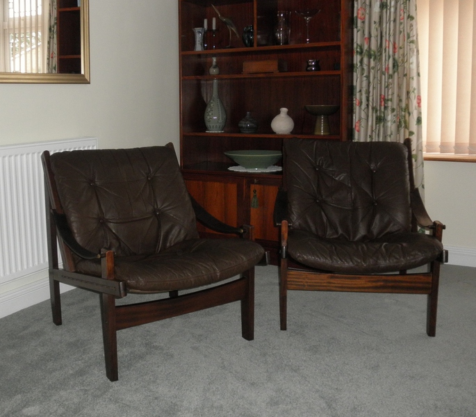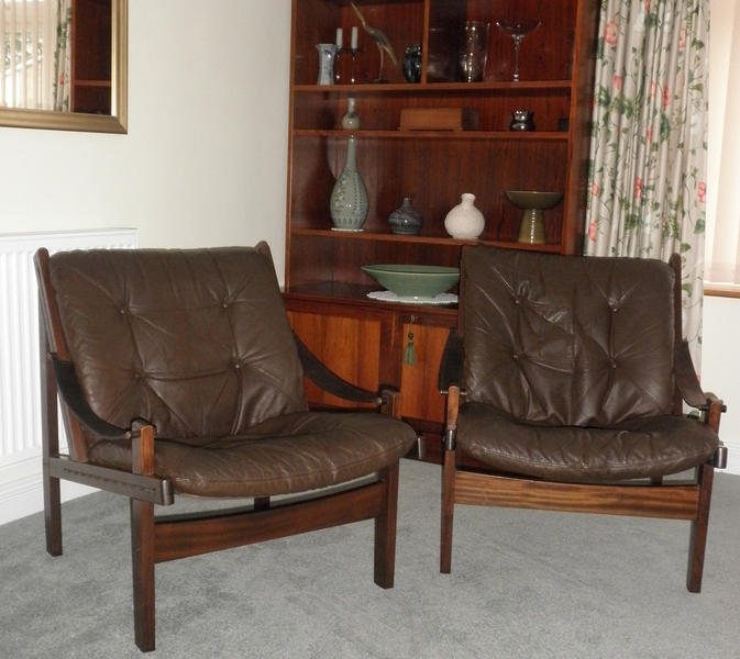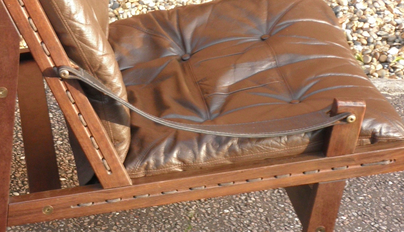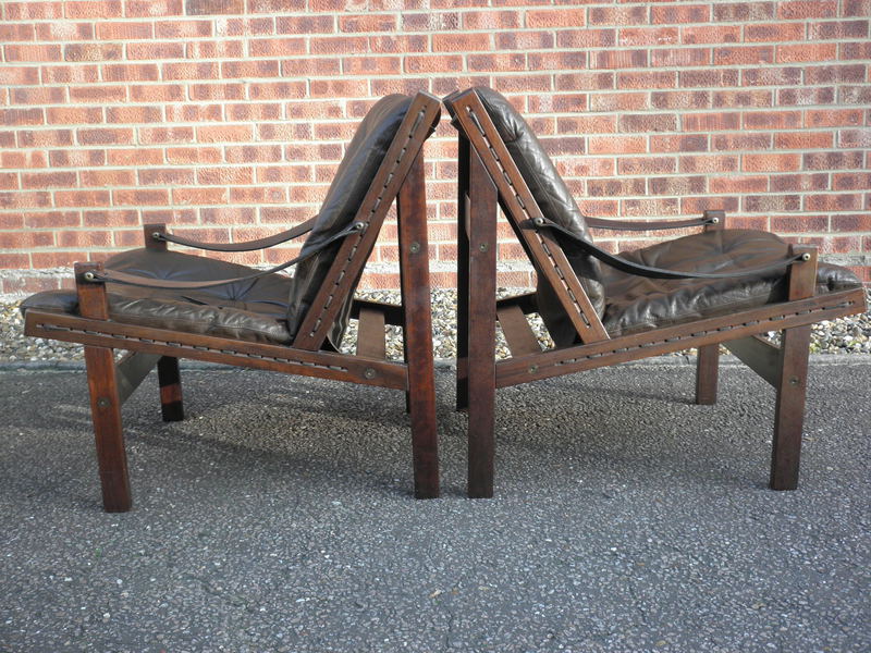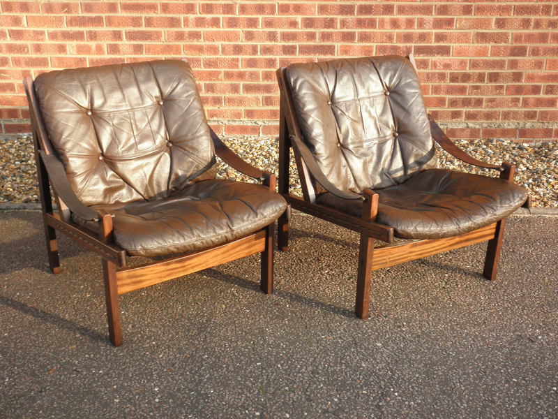 Produced by Bruksbo in Norway during the 1960s, and known as the Hunter chair, designed by Torbjørn Afdal (1917-1999). The sturdy wooden frame is stained beechwood to resemble patterned hardwood. The seats comprise heavy duty canvas supports with a padded leather cushion overlay and stout leather straps forming the sling or thong shaped armrests. Both the frames and leather cushions are in excellent condition.