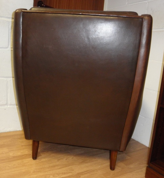 A classic and very comfortable 1960s Danish High-Back Lounge armchair in chocolate brown leather raised on turned, stained legs.