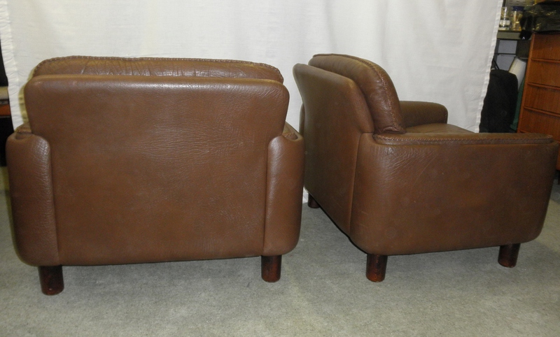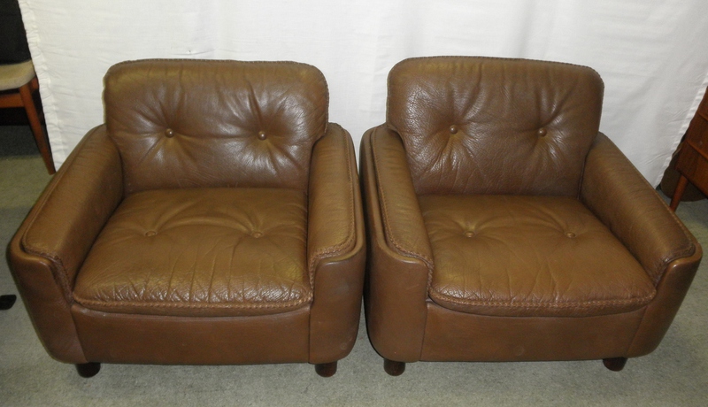 Produced and labelled by Vatne Møbler, Norway, and designed by Sigurd Resell as part of the Model 125 suite, this very attractive pair of brown leather low back armchairs are a rare find especially in such immaculate condition. Raised on short wooden legs and with a pleasing detail in the stitched edges to the cushioning; the arm pads of which slot neatly within the distinctively rounded corners on the frame of these exceedingly comfortable armchairs. Both chairs are in virtually pristine condition throughout, as is the high-quality buffalo leather with all buttons still in situ.