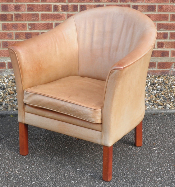 A Danish tub chair in soft, aniline, light tan leather with a separate seat cushion and teak legs is in very pleasing, vintage condition emphasising the quality and durability of this comfortable chair in the style of a Mogens Hansen’s MH 80 range designed in collaboration with Lars Kalmar (architect). Although unattributed, the leather is in extremely good condition throughout with minor colour changes due to light exposure but no tears.