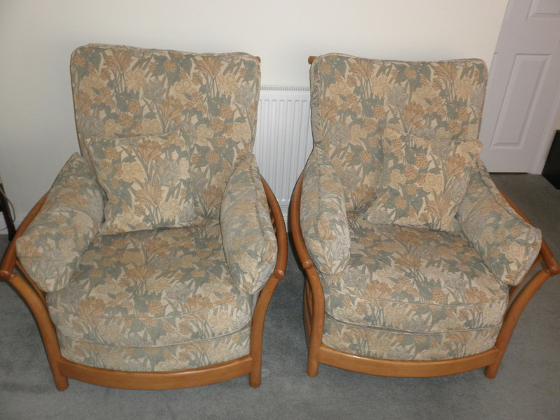 Produced in 2004, this pair of Ercol Renaissance high back armchairs with the Ercol metal button are in excellent, original condition. With sturdy frames in Ercol’s natural finish and ample cushioning with very strong, good quality Ercol fabric featuring a pattern of mixed flora and fauna in muted shades of green, gold and blue – all in excellent, unmarked and newly cleaned condition.
