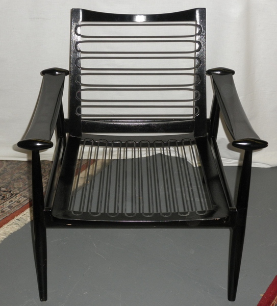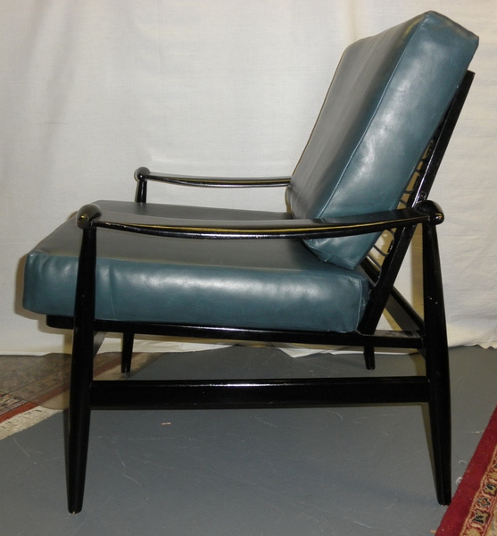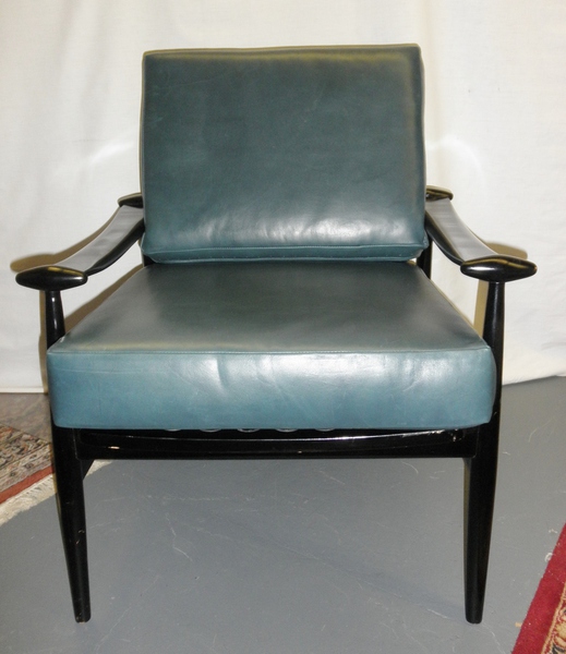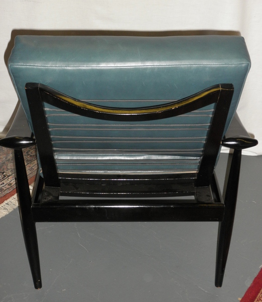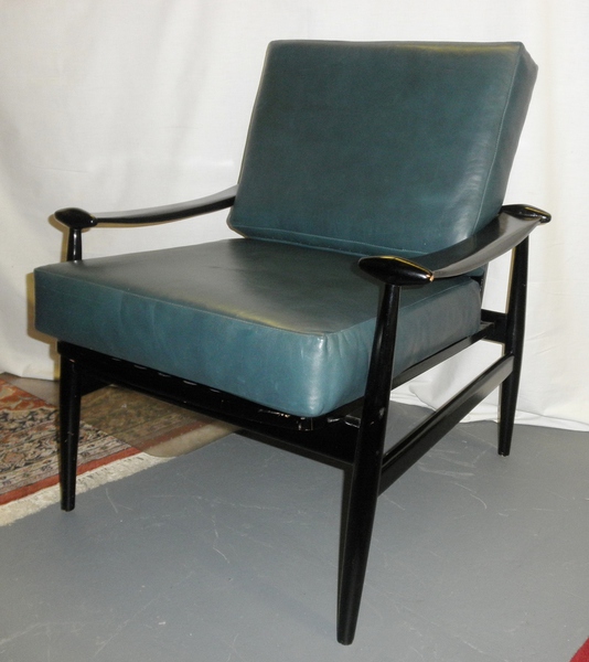 The iconic styled Spade chair by Finn Juhl - Model 133 - this vintage piece has a black lacquer finish with the original sprung base and back firmly supporting the stout and comfortable blue-green leather cushions. There are one or two minor dings to the lacquer finish but otherwise the armchair is in excellent condition and the supple leather is completely tear free.