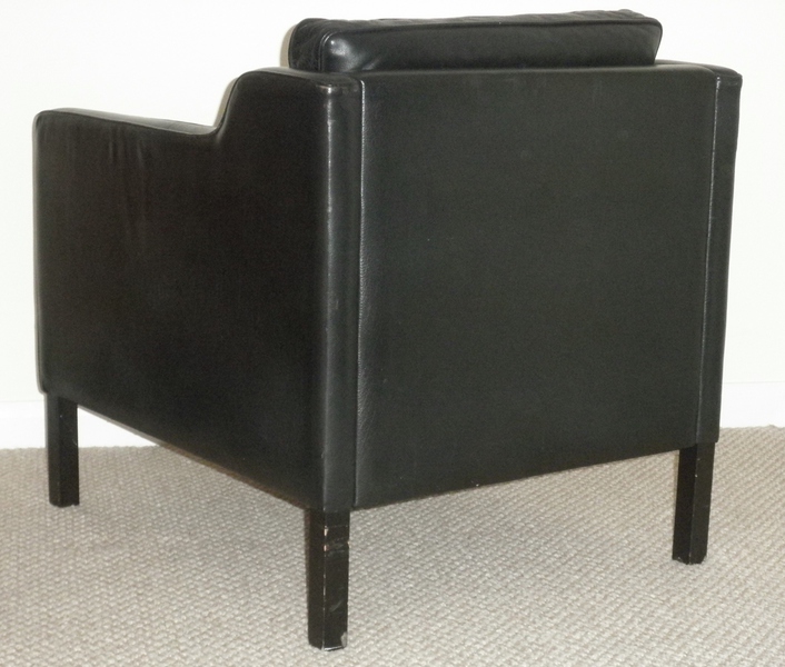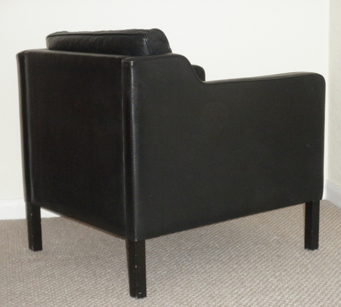 A classic mid-20th century Danish armchair in the style of the Model 2421 by Borge Mogensen. Although unattributed, this very comfortable chair retains the high quality finish evidencing production from one of the respected Danish manufacturers; it is in extremely good condition with supple black leather which has minimal signs of age related wear with no tears, and only minor scuffing mainly on the black wooden back legs.