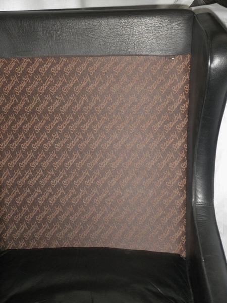 Raised on a dark frame and covered in the original top-quality black leather upholstery with piped seams and feather-filled cushions each having the distinctive Stouby logo lining on the reverse side.