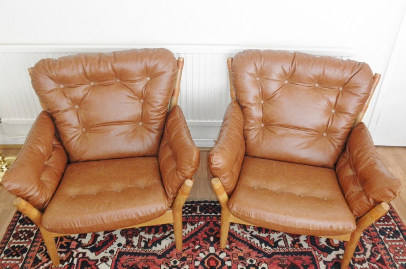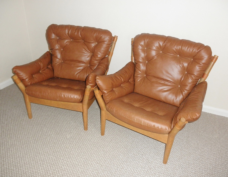 The leather used in the refurbishment of these chairs is the same as that on the similar style, Ilona sofa by Arne Norell - See Item Ref: SS 21.