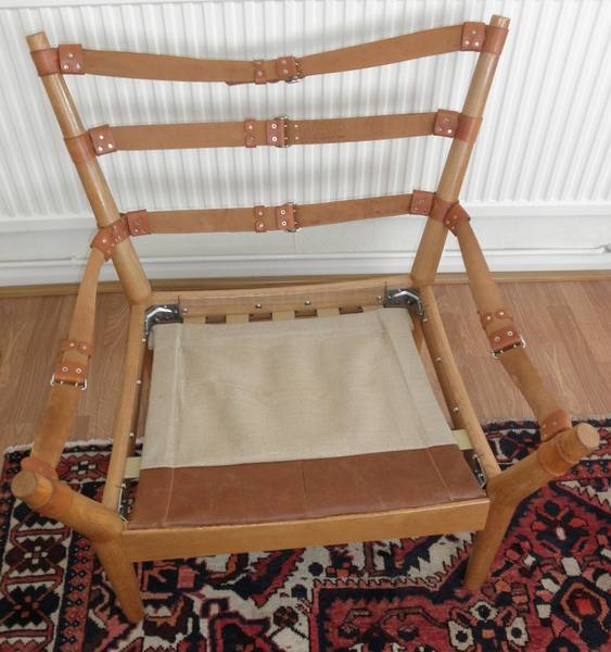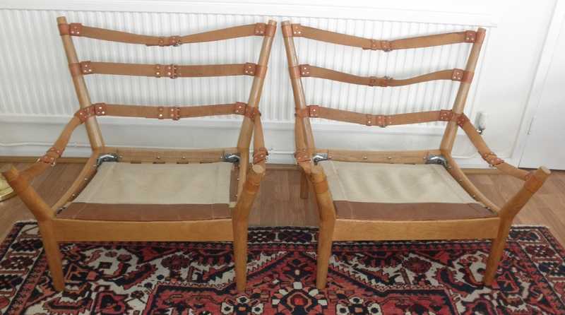 A pair of distinctive and rare Model 4521 lounge chairs designed in the 1960s by John Mortensen and produced by Magnus Olesen, Denmark. Comprising a robust frame of light oak with outward-curving uprights held together by stout tan leather straps and chrome buckles. A canvass sling seat base, over new Pirelli webbing, supports the ample cushioning covered in new top-quality tan leather. The back and arm cushions are feather-filled whilst the seat cushions have been upgraded with completely new foam inserts. Both chair frames are in exceptionally good, original vintage condition with very minimal scuffing and the reupholstered cushions are pristine, making the seats extremely comfortable and very attractive examples of mid-20th century furniture.