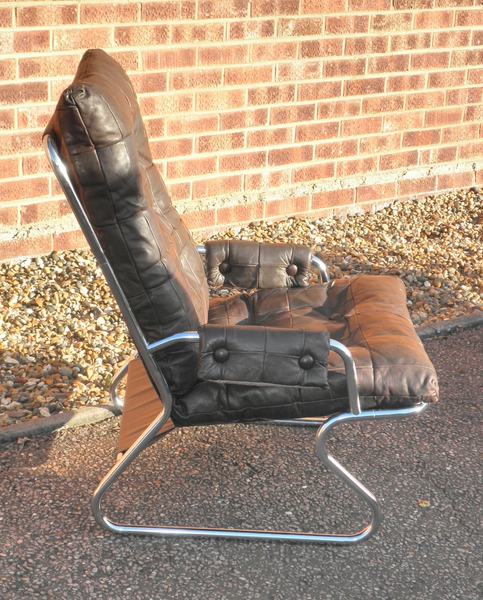 A 1970s open armchair with an attractively curved frame of chrome plated tubular steel with a slung seat supporting a single, well-cushioned and buttoned patchwork seat pad with matching patchwork leather covered armrests.