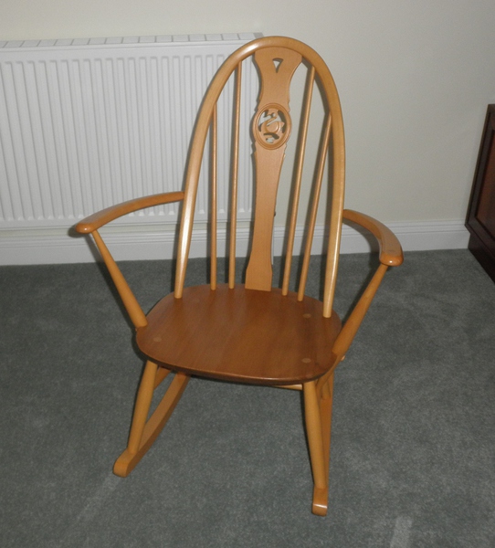 An Ercol Swan Back Windsor Rocking Chair in traditional light finish including the original seat cushion. The seat is made from solid elm with the usual Ercol shaping of Windsor tall-framed spindles and rockers all being made from beech with the central splat having the attractive Ercol carved swan motif. The chair is relatively compact, in good sturdy condition with virtually no signs of use although the seat pad could benefit from being recovered in a more up to date fabric.