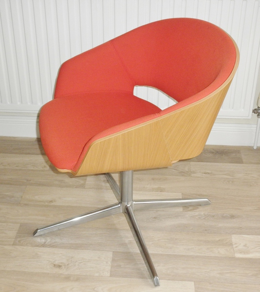 Designed by a present day and very successful, multi award winning British designer, David Fox, and produced by Connection Seating Limited, were initially created for more public or corporate settings but the striking design has been so popular and proven to be equally desirable for any contemporary interior. With a beautifully shaped oak veneered shell surrounding a well-padded upholstered seat on a cross wire frame or die cast base option making the chair an elegant solution for a home office/ study or sitting-room.
