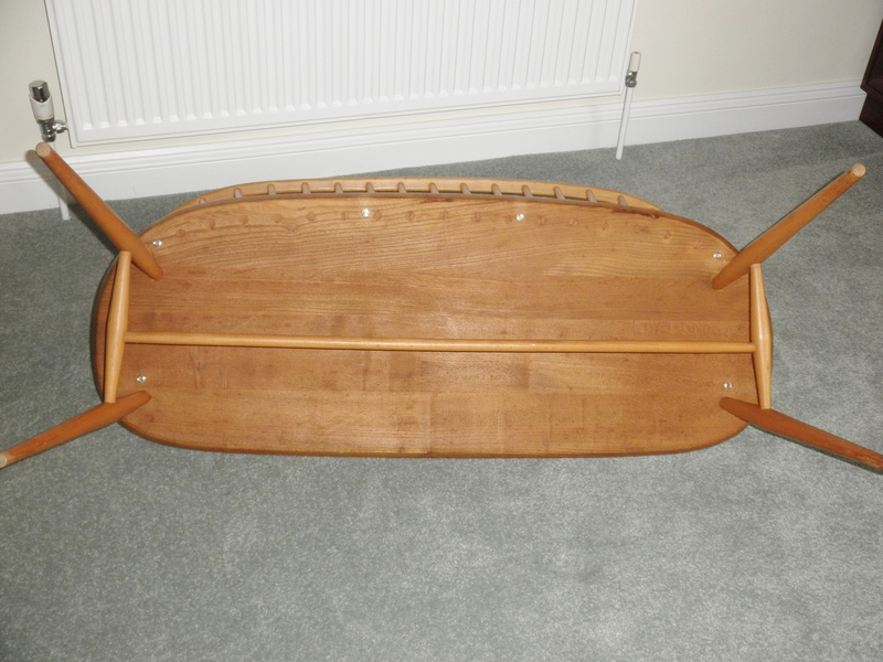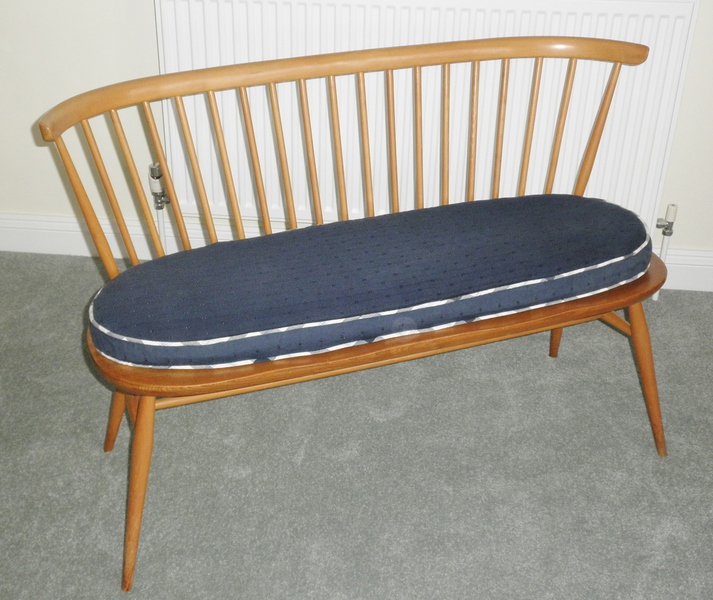 This Model 450 is the later version Ercol introduced in 1960 with 19 spindles, still light weight and retaining the original beautiful finish, this completely original bench / settee is in immaculate condition and includes a piped, deep blue seat pad, although Ercol’s shaped seat is actually very comfortable and can be used without the cushion.