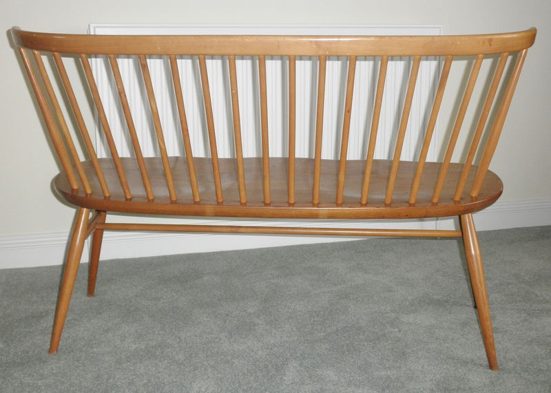 Ercol introduced the Love Seat dining bench / settee – Model 349 - in the 1956 catalogue comprising a gently curved back rail supported on 13 turned spindles piercing the shaped elm seat, raised on the stretchered turned legs.