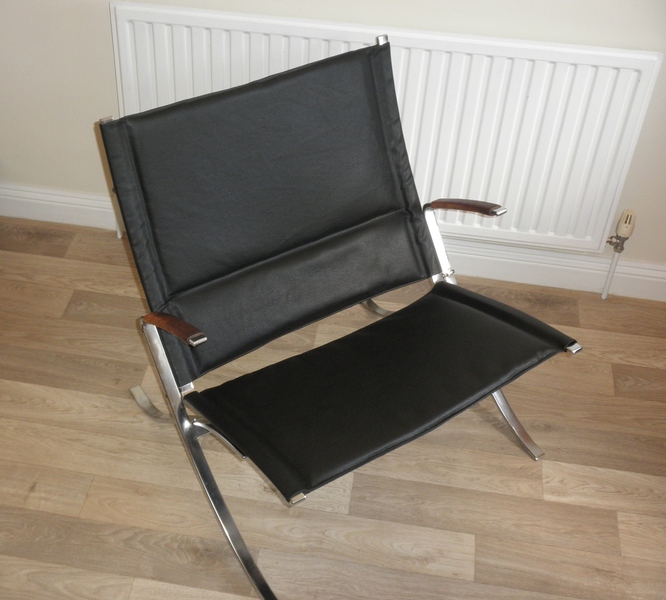 An original, labelled, FK 82 armchair designed by Preben Fabricius (1931-2007) and Jorgen Kastholm (1931-1984) for the German manufacturer, Kill International, in the early 1960s. The armchair comprises a striking chromed steel frame, the simplicity of which is emphasised by the construction, which probably dates from around the 1970s, united by the back rest and seat pad that has now been replaced with sturdy, reinforced, black vinyl.