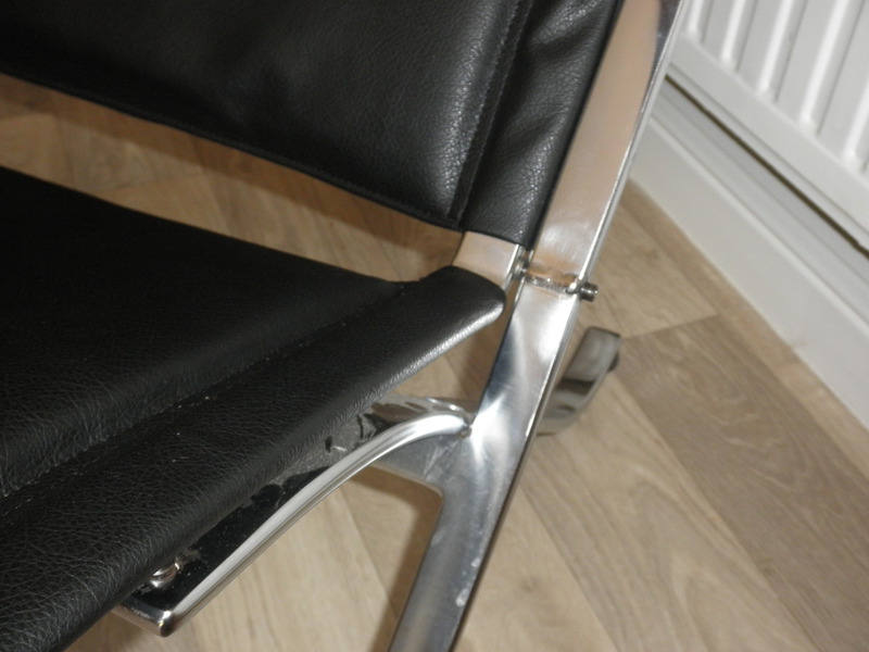 The armrests retain the original bound, brown leather with evidence of normal use with the left-hand arm having been professionally welded following an earlier fracture most likely where someone has tried to stand on the arm to reach something high. However, the weld has been carefully executed to retain the original form and strength without detracting from the overall appearance and this has been reflected in the pricing of this standout and highly sought-after, iconic design.