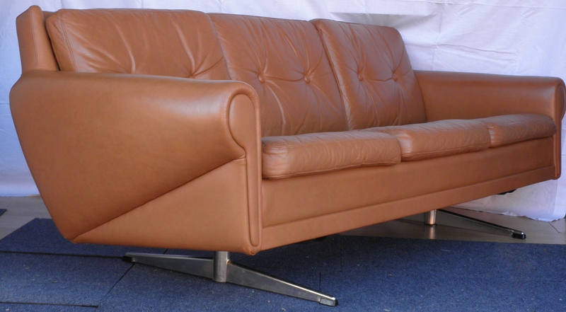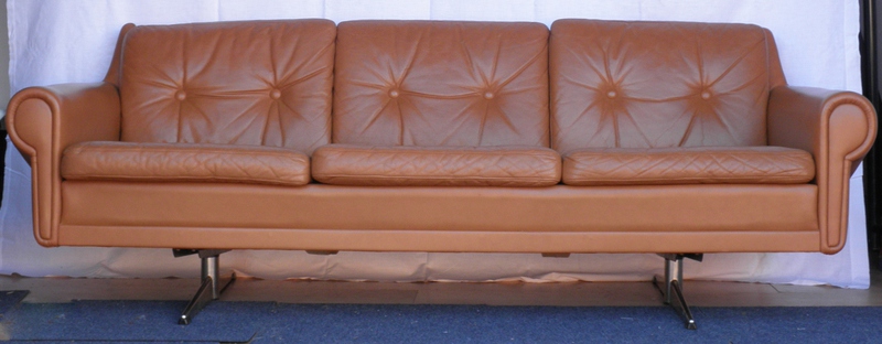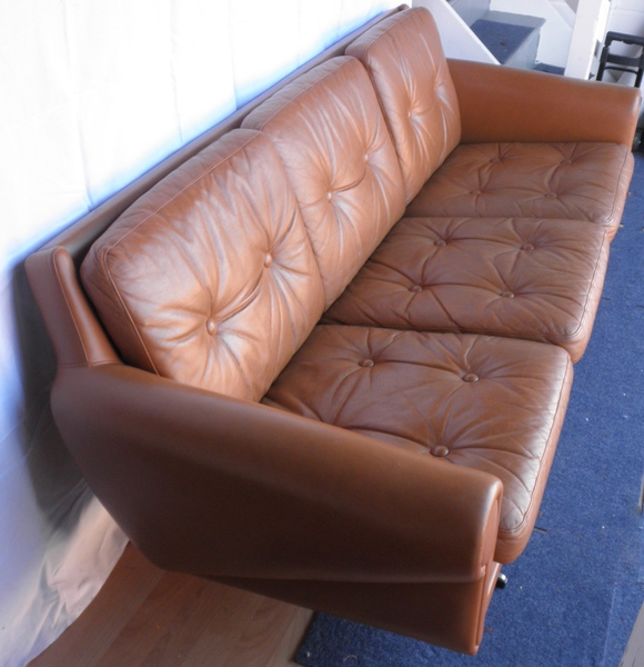 A superb quality tan leather, 1960s Danish style 3 seater settee raised on two ‘T’ bar chrome legs with rubber feet. The sofa is covered in soft and supple tan leather with buttoned seat and back cushions, all of which are in extremely good condition, with no rips or tears and relatively scuff free. The sofa has a gently sloping back and beautifully shaped arms which create a very elegant, sleek and stylish vintage mid 20th century piece of furniture.