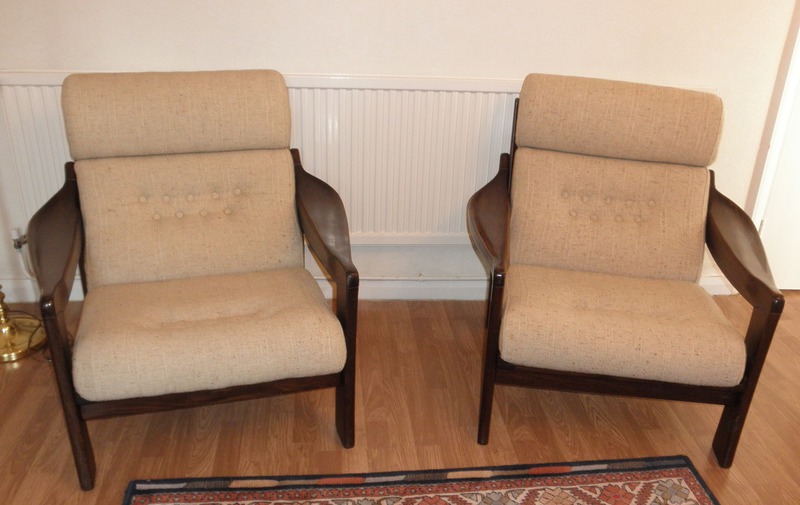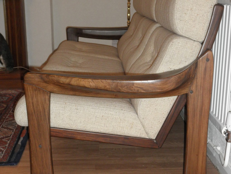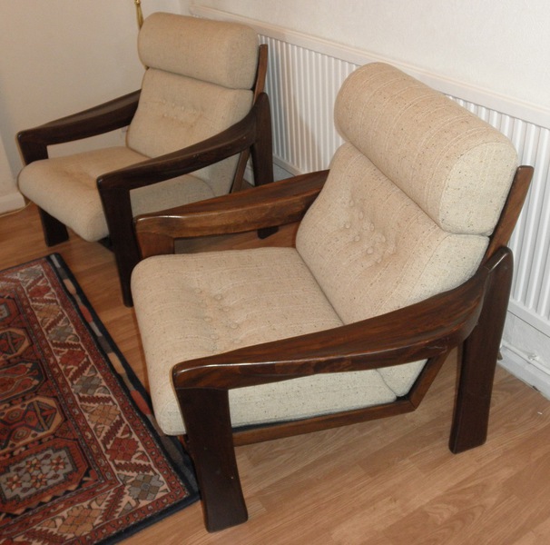 The sturdy and very attractively shaped, dark hardwood frames designed to be seen from any angle with a slatted back and featuring unusually broad and beautifully curved armrests – all in excellent condition and with the contrasting oatmeal wool upholstered cushioning. This high quality three-piece suite continues to offer an extremely rare and stylish mid-20th century design.