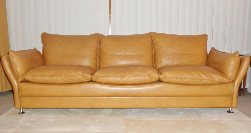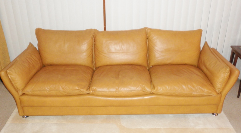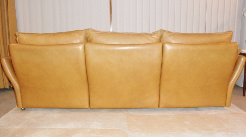 With gently outward curving arms this relatively long and very stylish 1980s Danish sofa by Svend Skipper is covered in wonderfully soft and supple leather. The cushions are feather filled and in virtually pristine, as new condition. As with all Skipper furniture, the high quality is evident in the comfort and overall exceptional appearance with only very minor abrasions on the front corners of the arms and a few minor scuffs on the back of the sofa; none of which detract from the excellent vintage condition. The sofa is raised on chromed front legs with ball castors at the rear for ease of movement. If necessary, the arms and three back sections can be unbolted for ease of transport.