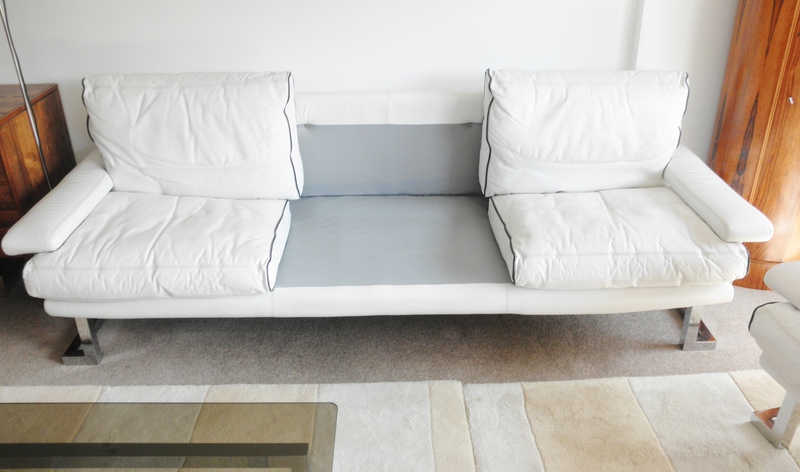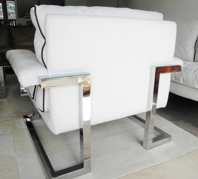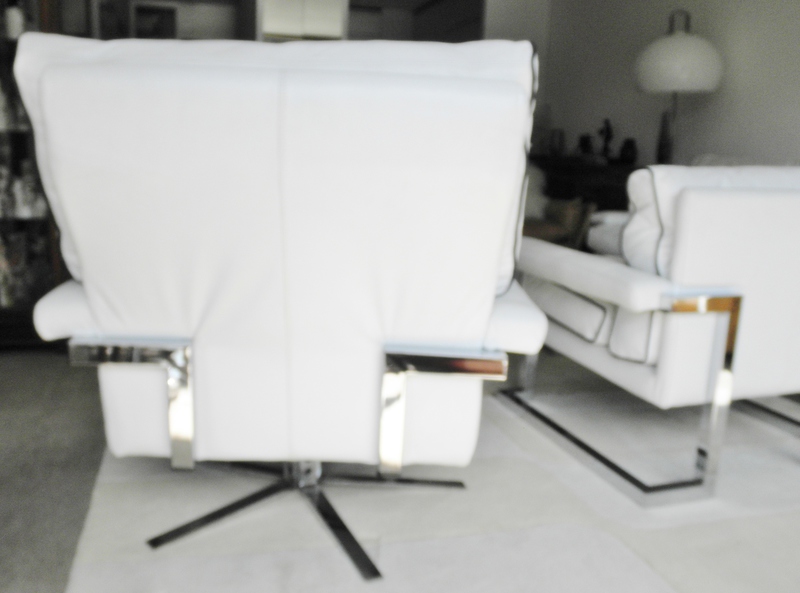 An extremely attractive and sought-after design is this complete lounge suite from Pieff comprising a 3 seater sofa, armchair and swivelling lounger with ottoman / foot stool - all in wonderfully supple white leather with black piping and chrome in excellent condition.