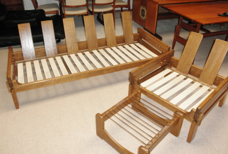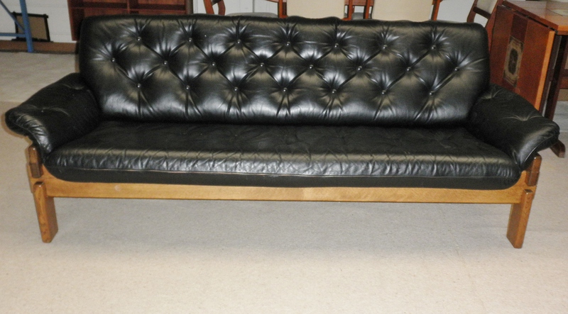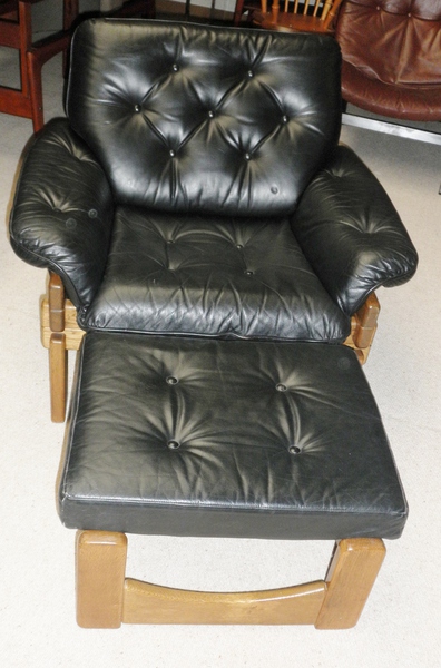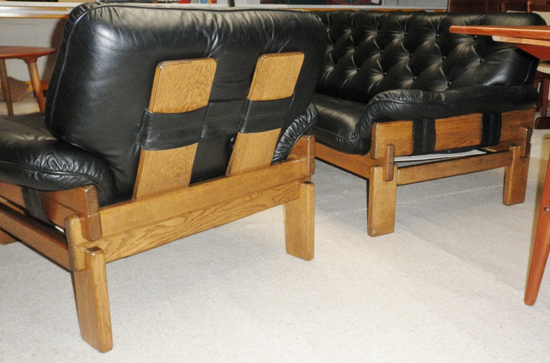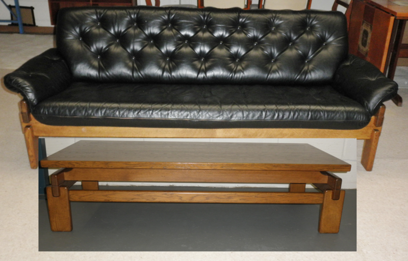 A 1960s/1970s oak and black leather suite of lounge furniture comprising a low-back 3 seater sofa with matching armchair, ottoman (foot stool) and a substantial rectangular, low oak coffee table featuring tusk or keyed mortice and tenon joints.