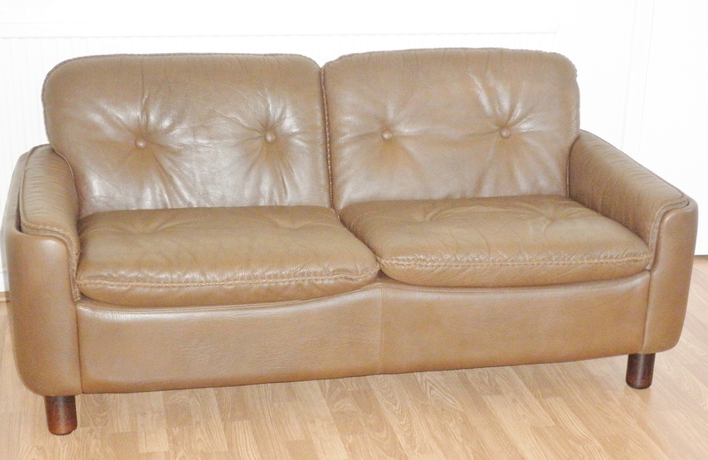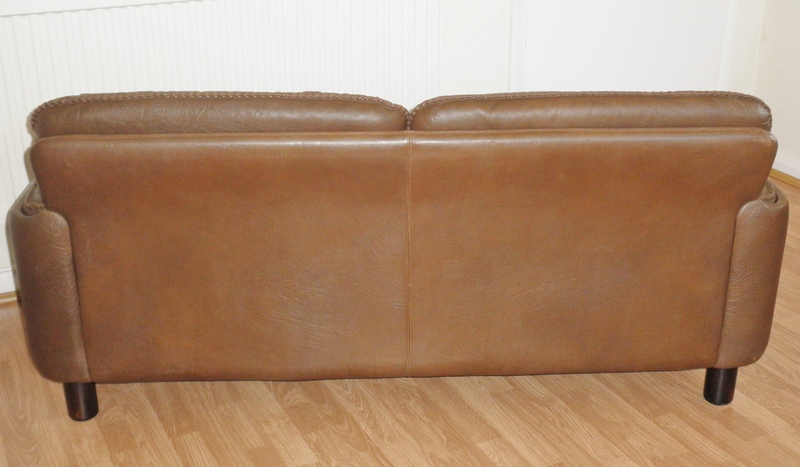 Part of the Model 125 Suite designed by Sigurd Resell for Vatne Møbler, Norway, labelled and featuring the very distinctive detail in the stitching (sometimes described as baseball glove style stitching) of the attractive and high-quality brown buffalo leather which, apart from two minor marks to one arm ( see photo ) is in immaculate, pristine condition. Raised on the original dark wooden legs which match the two armchairs available and listed under Ref: EC 31 - together form a very rare, extremely comfortable and iconic suite of mid-20th century Scandinavian furniture at its best.