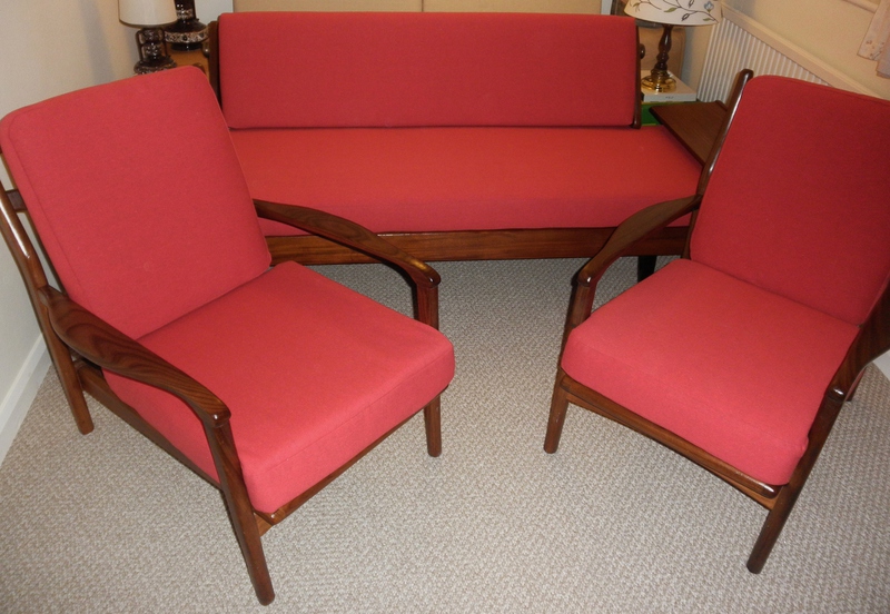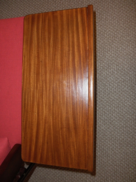 One side tray has a faint ring mark and minor bubbling in the veneer that does not detract from the overall appearance of this piece which is in very good vintage condition having newly replaced and recovered cushioning in bright red fabric.