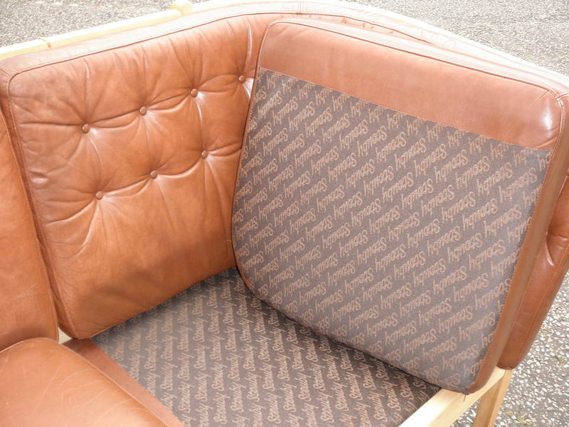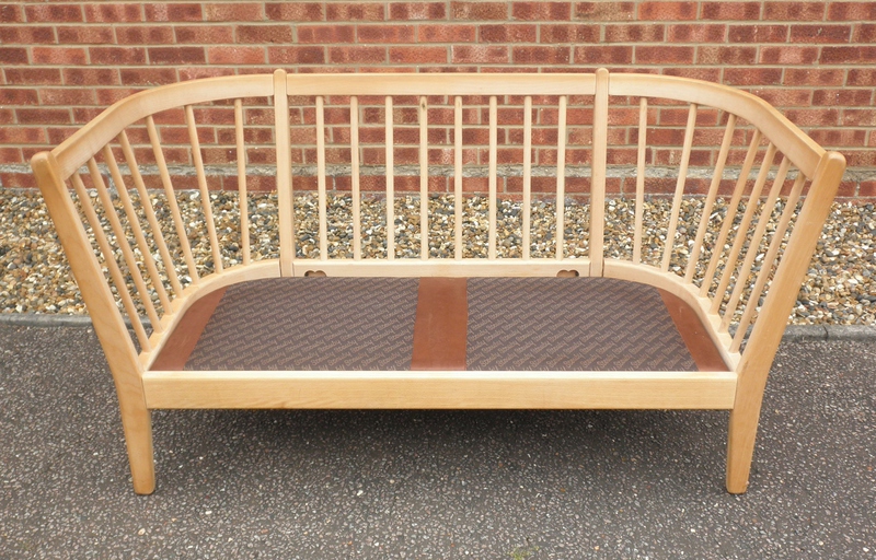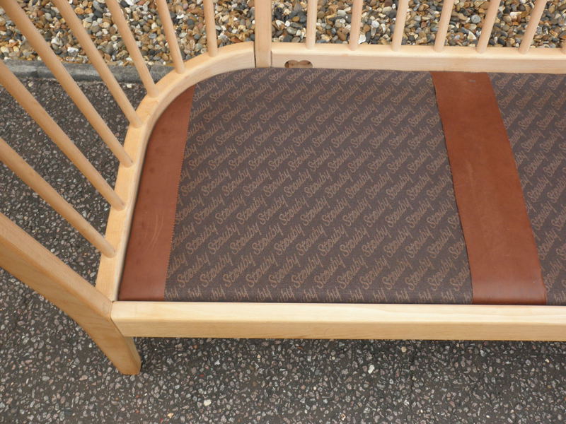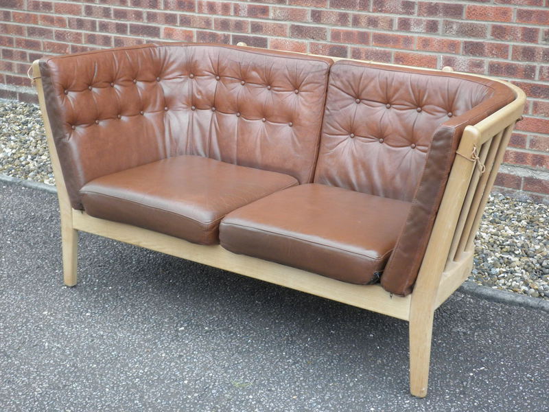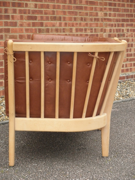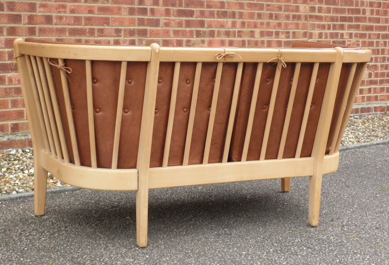 Having a curved, spindle-back, beech frame enclosing the two seat cushions and two curving buttoned back cushions which are anchored to the frame with leather-lace ties - all in a warm conker brown leather.