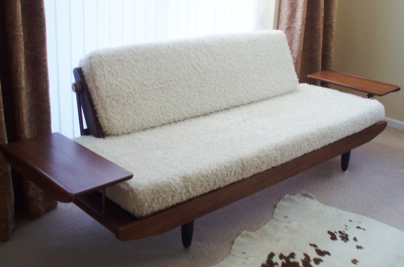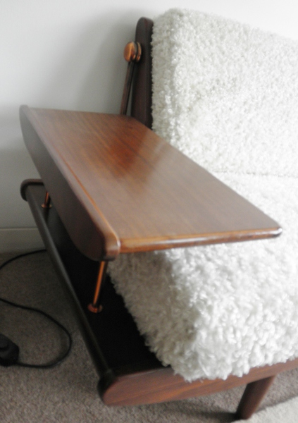 One side tray has a small ring mark and some wear to the copper finish on the back fold-over hinge. The frame is in very good vintage condition having new replacement cushions covered in luxuriously soft faux sheepskin fabric making this an extremely attractive piece of mid-20th century furniture.