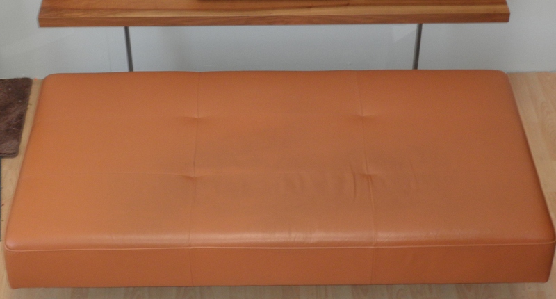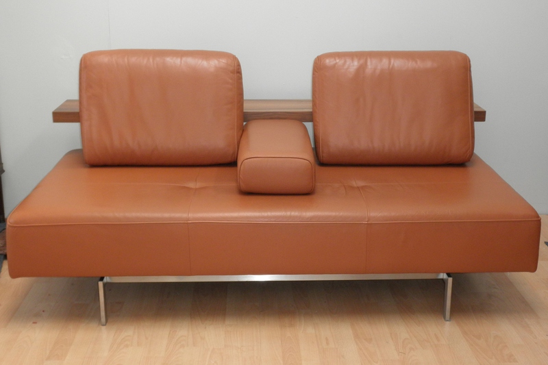 The cushions can be simply hung into position anywhere along the full-length shelf providing alternative seating configurations, and the main seat slab can be pulled forward on internal rollers to transform the sofa into a day bed or guest bed to fulfil the versatile requirements of present-day lifestyles.