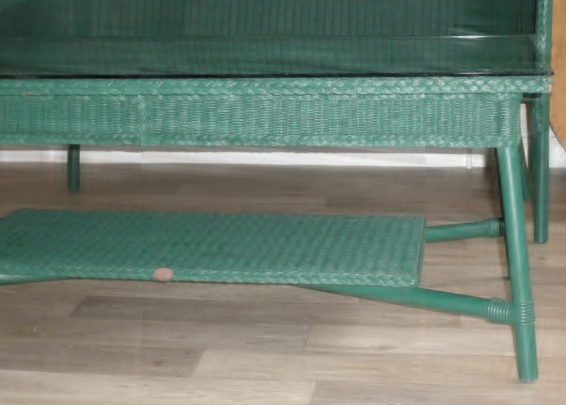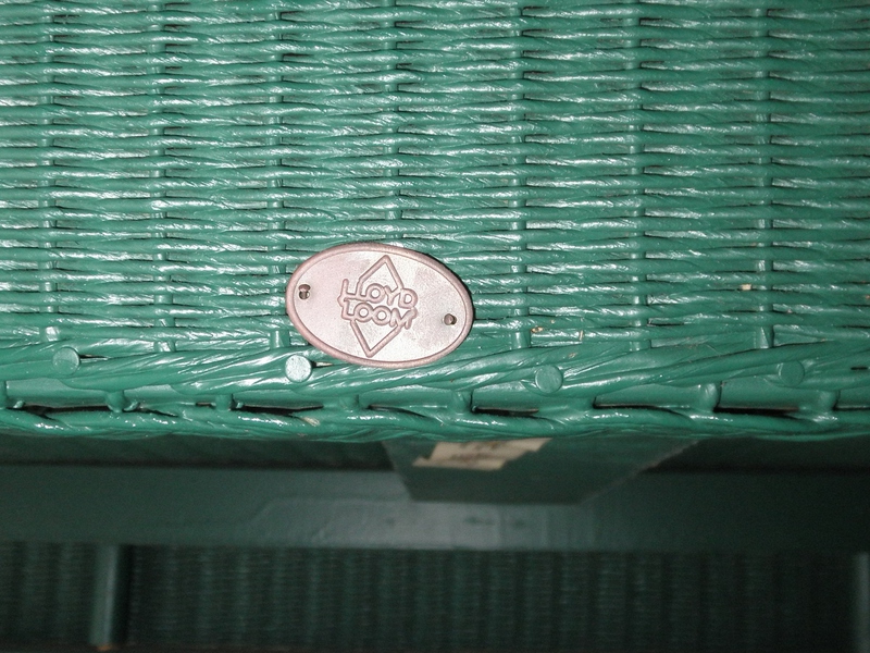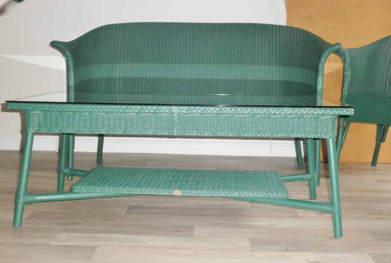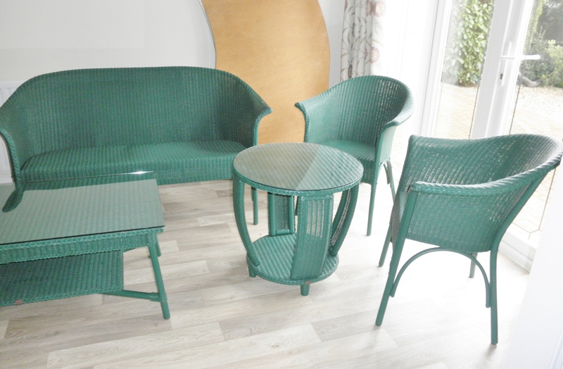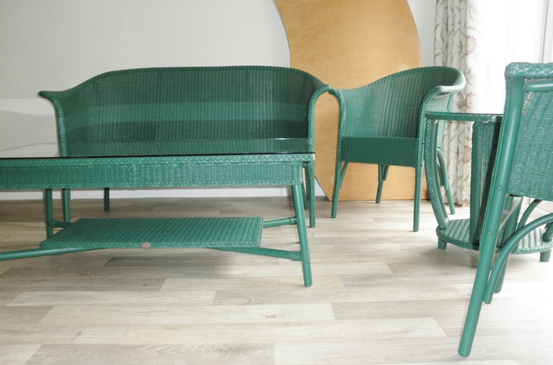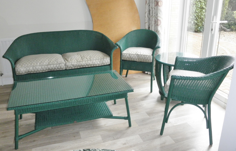 This beautiful set of Lloyd Loom furniture comprising a two-seater sofa, two armchairs (together with attractive cushioning) and two occasional tables each with a glass surface, all in a deep green that would look fabulous in a well-stocked conservatory or orangery but, equally, would not look out of place in a sunroom and be very comfortable as a normal living-room suite.